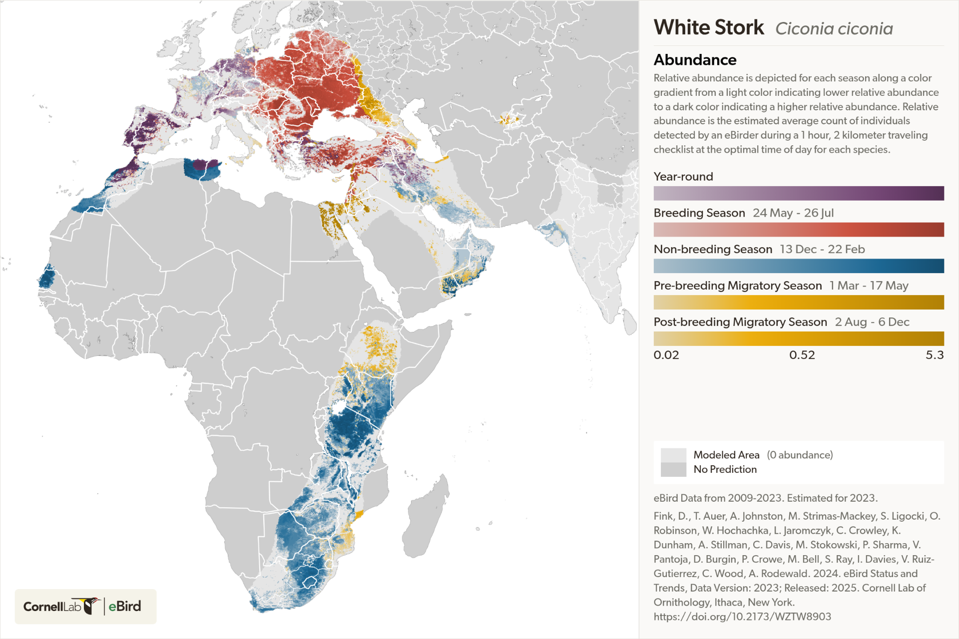 El censo divide las poblaciones en regiones según Schulz (1999). La población global ha mostrado un crecimiento positivo general, atribuido a medidas de conservación como la protección de nidos, restauración de humedales y reducción de amenazas como la electrocución. Sin embargo, persisten declives en áreas periféricas del noreste europeo.