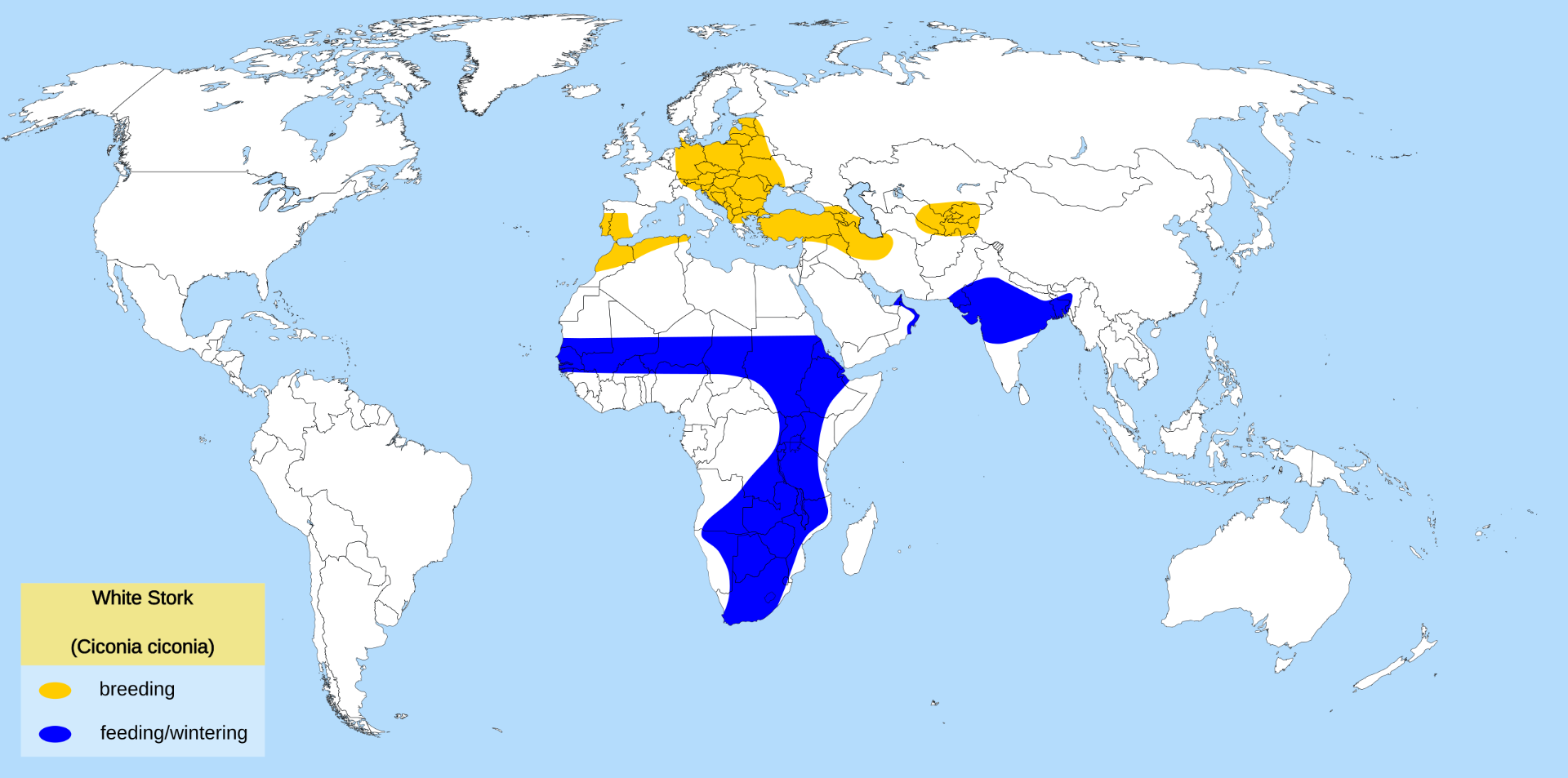 Otro mapa simplificado que destaca las áreas de reproducción (amarillo) y alimentación/invernada (azul):